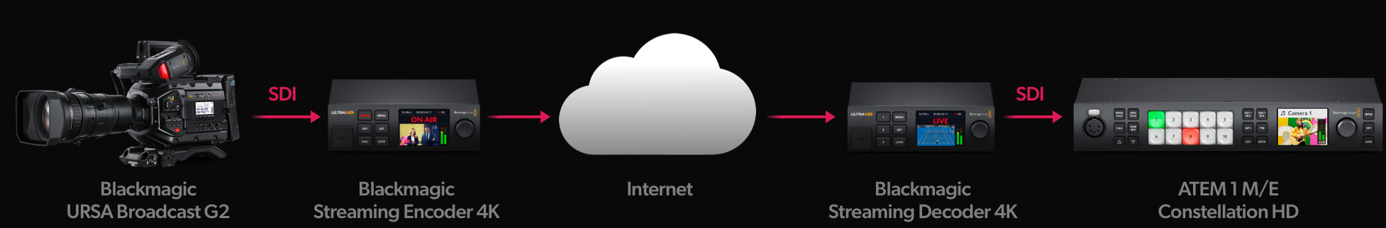 Blackmagic Streaming Decoder là một bộ xử lý truyền phát cho phép khách hàng xây dựng các liên kết phát sóng qua internet với Blackmagic Streaming Encoder. Blackmagic Streaming Decoder 4K nhận luồng H.264 hoặc H.265 từ Blackmagic Streaming Encoder và chuyển đổi nó thành video SDI và HDMI. Thêm vào đó, hầu hết các máy quay Blackmagic Design đều có tính năng truyền phát tích hợp như Blackmagic Studio Camera Pro, PYXIS, URSA Cine và URSA Broadcast G2, vì vậy khách hàng có thể truyền phát trực tiếp từ các máy quay này mà không cần thêm phần cứng. Điều này có nghĩa là khách hàng có thể gửi video điểm-điểm giữa các địa điểm từ xa. Blackmagic Streaming Decoder cũng có đầu vào "tham chiếu" 12G-SDI cho phép khách hàng kết nối tally SDI, điều khiển máy quay cộng với talkback và gửi ngược lại đầu bộ mã hóa. Mọi người đều ở xa, nhưng vẫn làm việc cùng nhau.