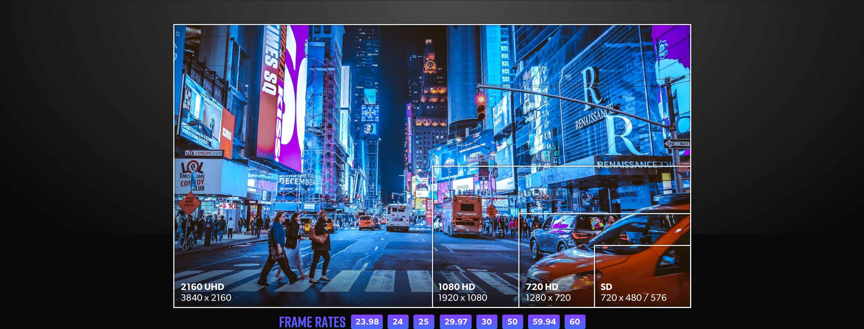 Kết nối DeckLink IP là đa tốc độ, vì vậy nó hỗ trợ tất cả các định dạng SD, HD và Ultra HD, tùy theo kiểu máy. Trong độ phân giải tiêu chuẩn, DeckLink IP hỗ trợ cả tiêu chuẩn 525i59.94 và 625i50. Trong HD, tất cả các thẻ DeckLink IP hỗ trợ các tiêu chuẩn 720p, 1080i và 1080p lên tới 1080p60. Trong Ultra HD khách hàng có thể nhận được sự hỗ trợ cho tất cả các tiêu chuẩn lên tới 2160p60. Tiêu chuẩn video có thể được đặt độc lập cho mỗi kênh và chuyển đổi ngay lập tức khi được thiết lập bằng cài đặt tiêu chuẩn video mặc định trong Desktop Video Utility hoặc trực tiếp qua DeckLink SDK.