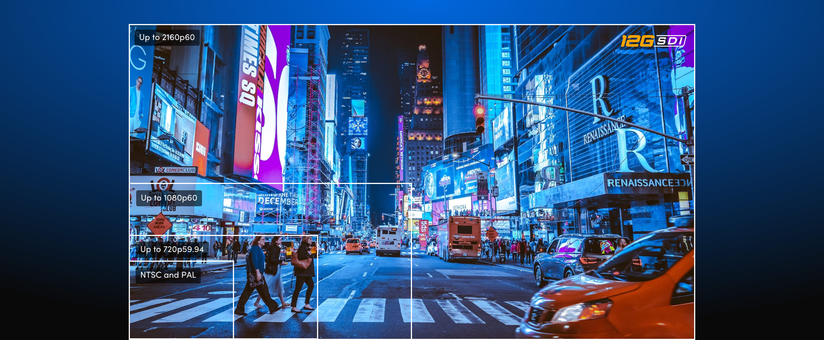- Đa tốc độ 12G-SDI và HDMI 4K mới nhất cho SD, HD và Ultra HD.