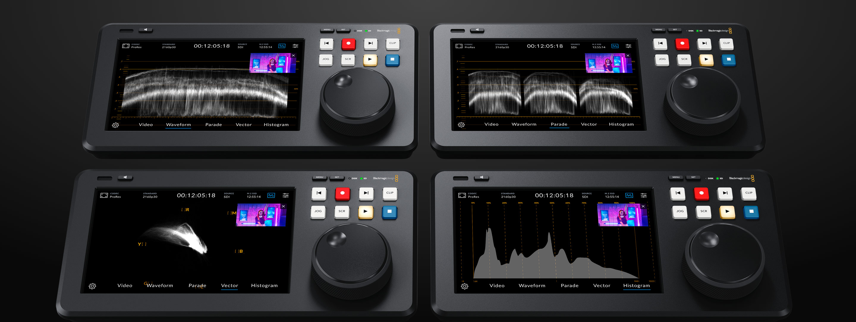 HyperDeck Shuttle 4K Pro cung cấp khả năng giám sát sóng mạnh mẽ tích hợp cho công việc cao cấp, đảm bảo tuân thủ các tiêu chuẩn phát sóng. Màn hình sóng cung cấp chế độ xem mức độ sáng truyền thống của tín hiệu đầu vào hoặc phát lại. Màn hình vectorscope cho phép khách hàng nhìn thấy cường độ màu ở các mức tham chiếu SDI 100%. Khách hàng cũng có được các màn hình parade RGB và YUV, lý tưởng cho việc hiệu chỉnh màu sắc và kiểm tra các mức độ bất hợp pháp. Biểu đồ hiển thị phân bố chi tiết từ trắng đến đen trong hình ảnh của họ và cắt bớt vùng sáng hoặc bằng. Bạn có thể chồng các phép đo tích hợp lên video trực tiếp hoặc hiển thị dưới dạng một khe ảnh nhỏ tại góc trên bên phải của phép đo.